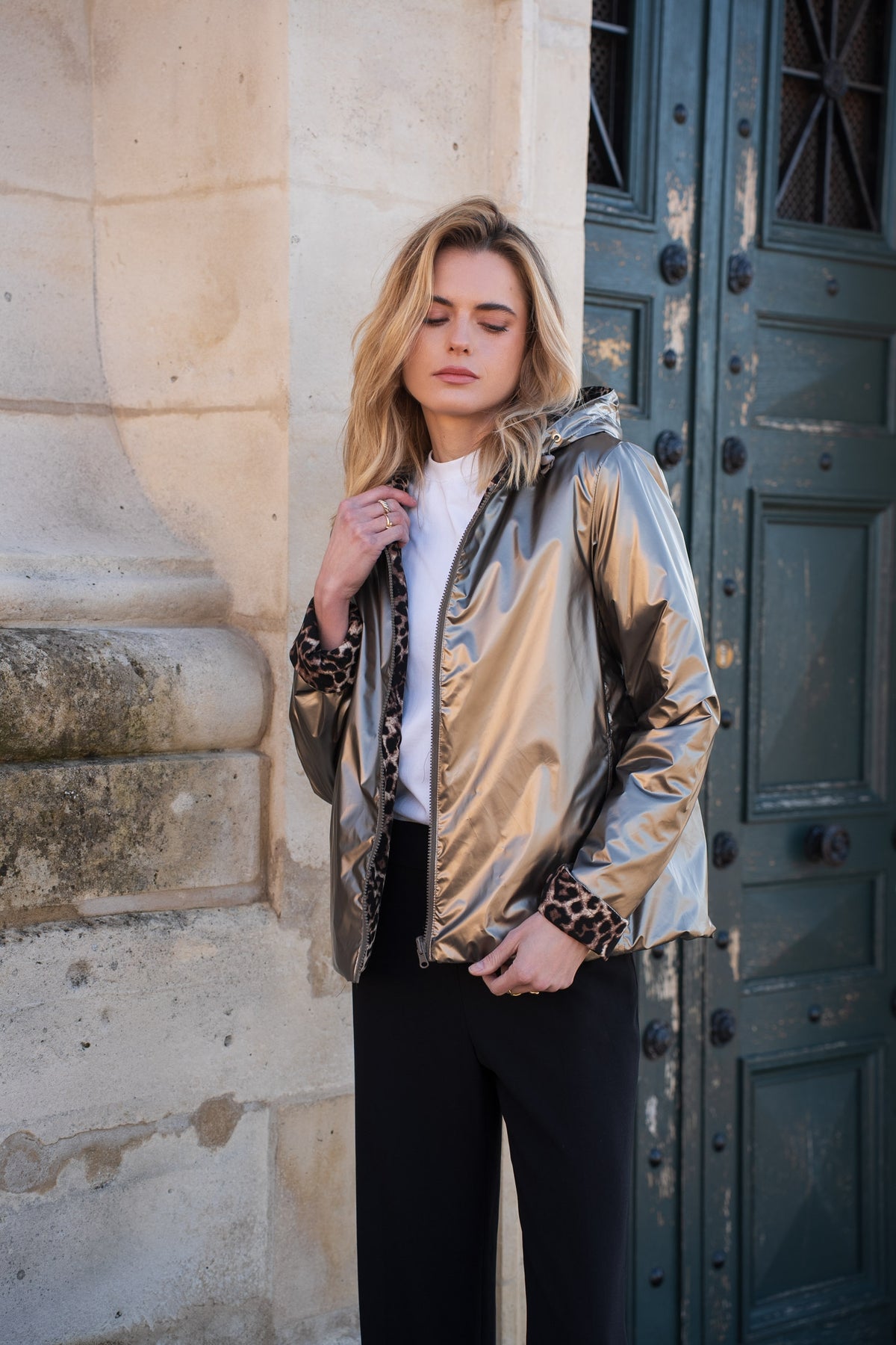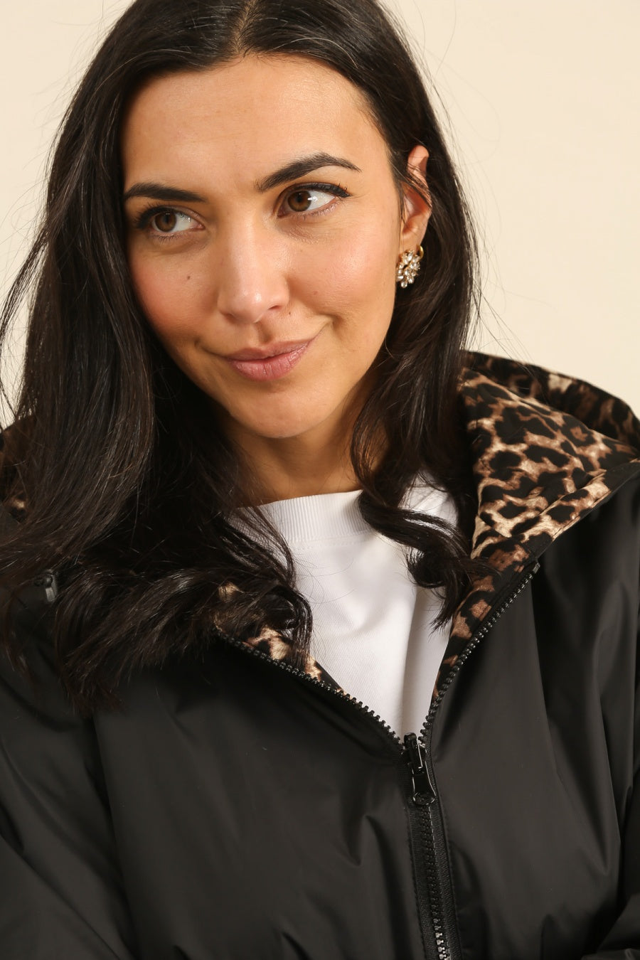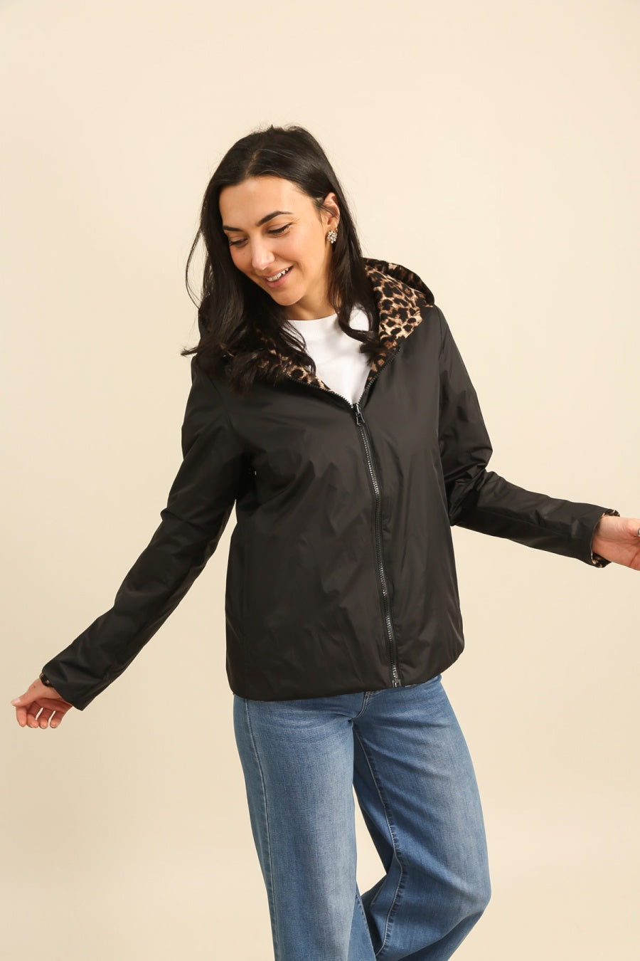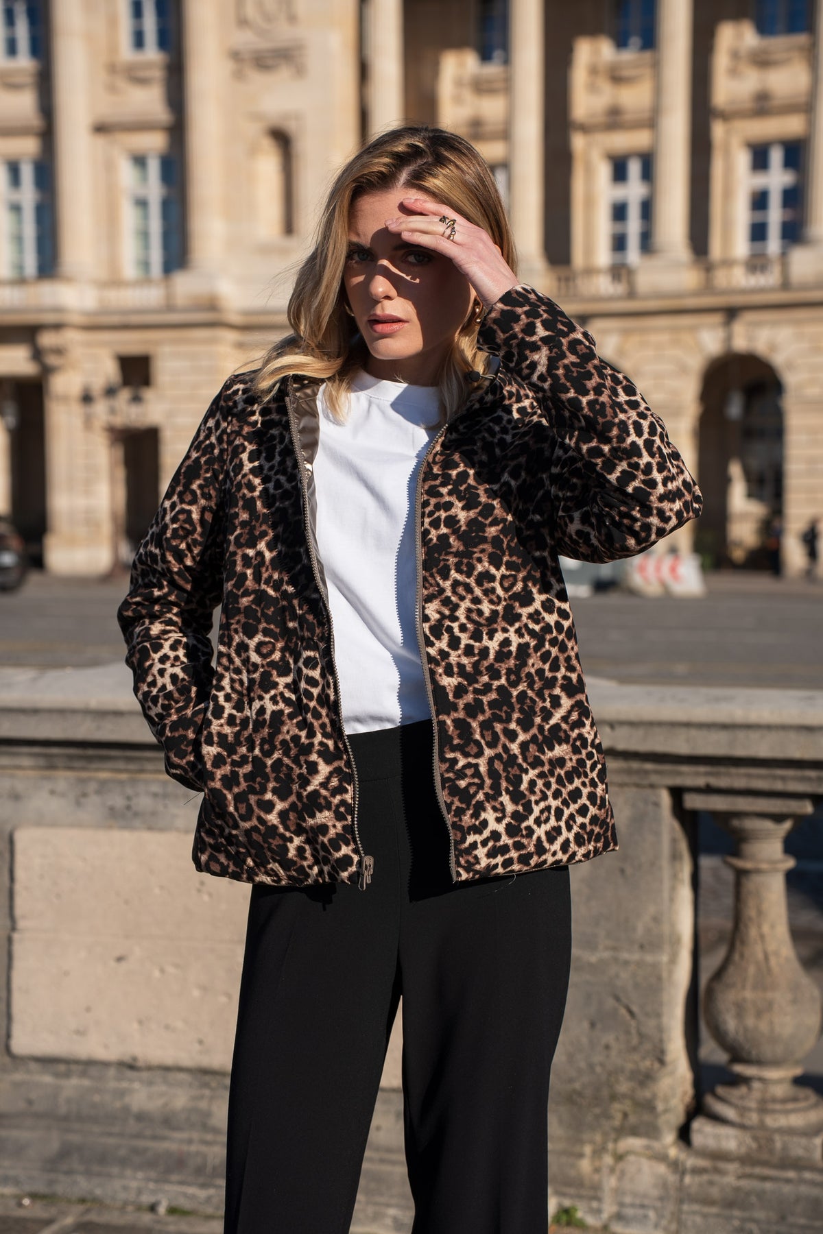 Découvrez la veste mi-saison idéale : un imperméable réversible court en version léopard, parfait pour rester élégante tout en étant protégée des intempéries.