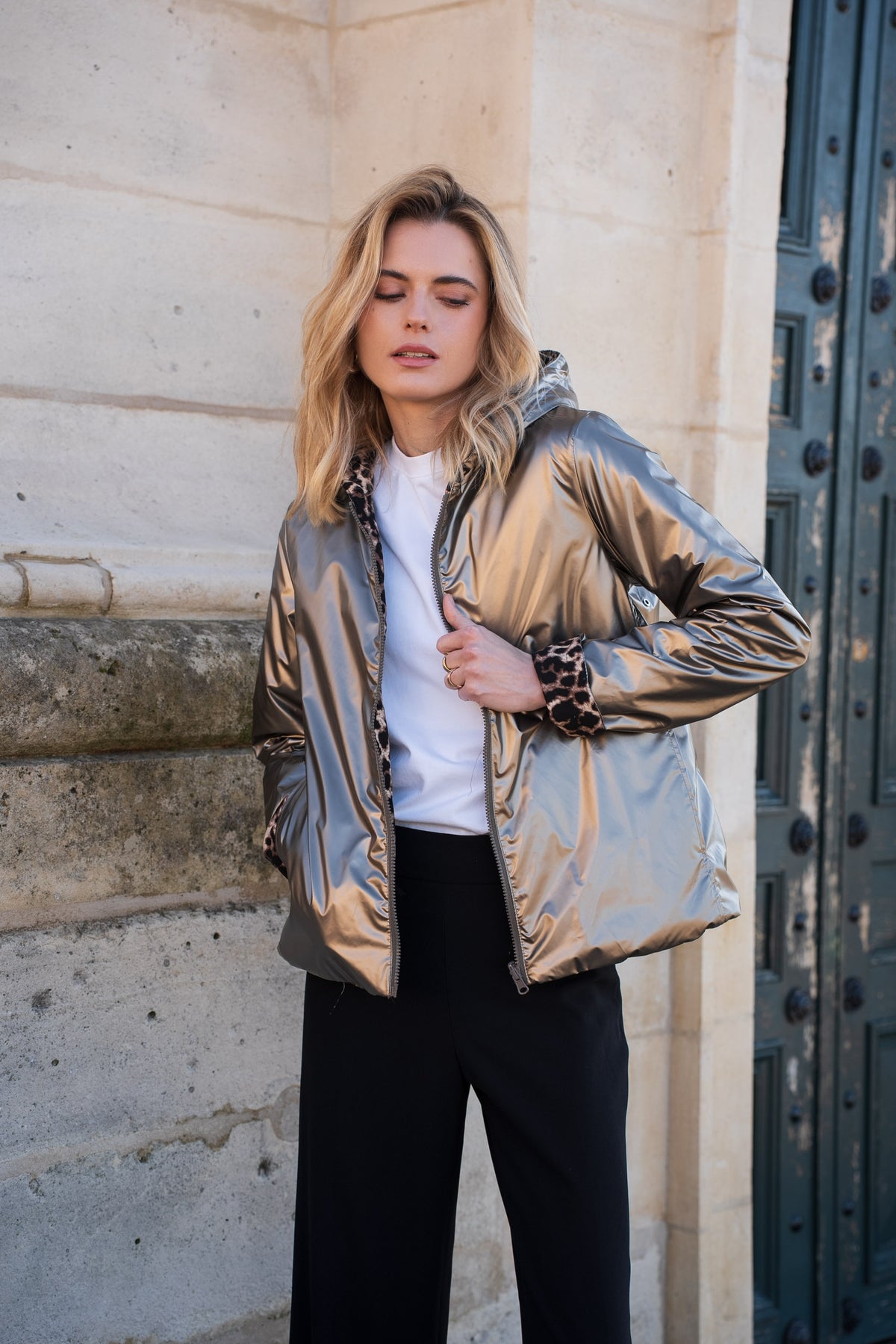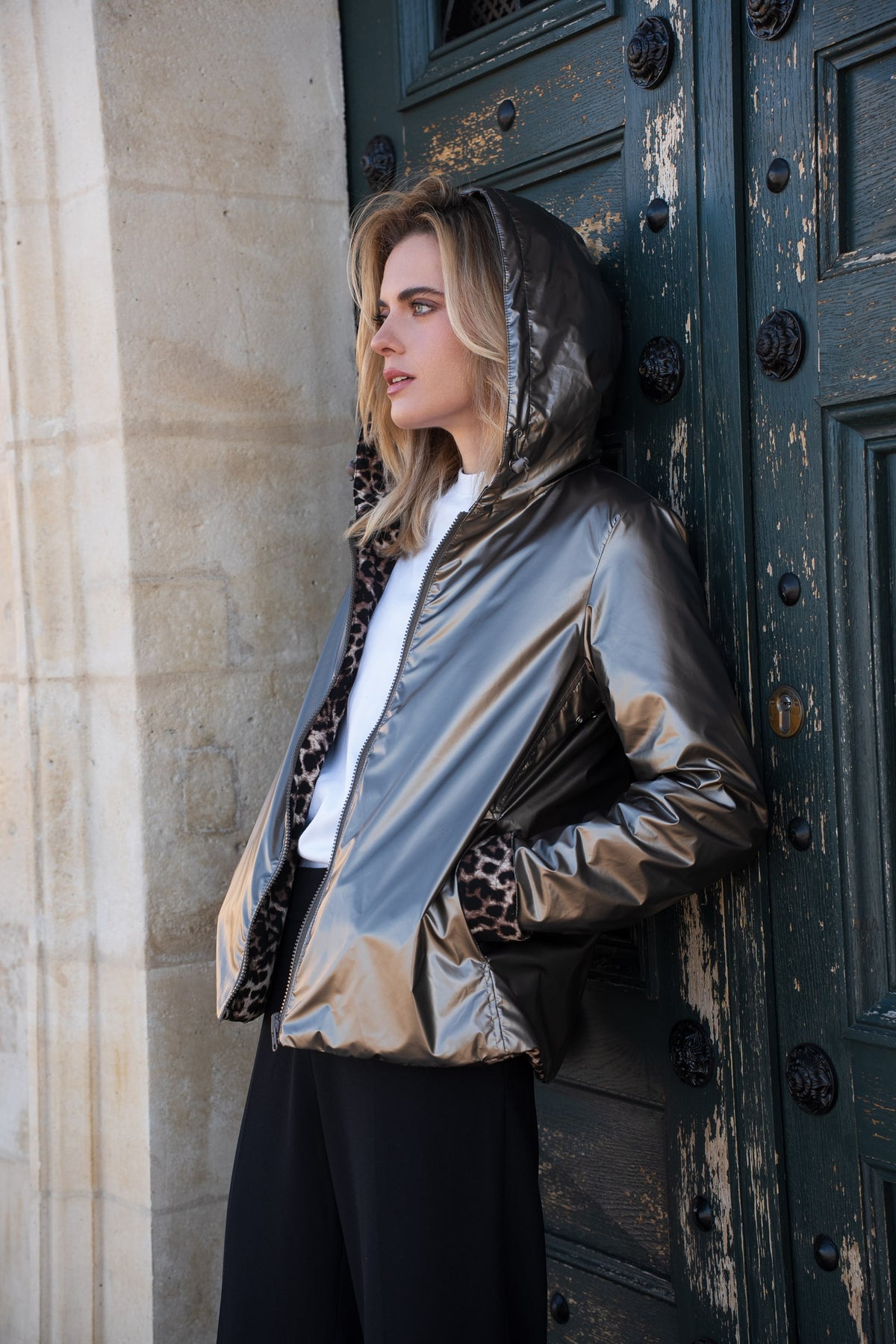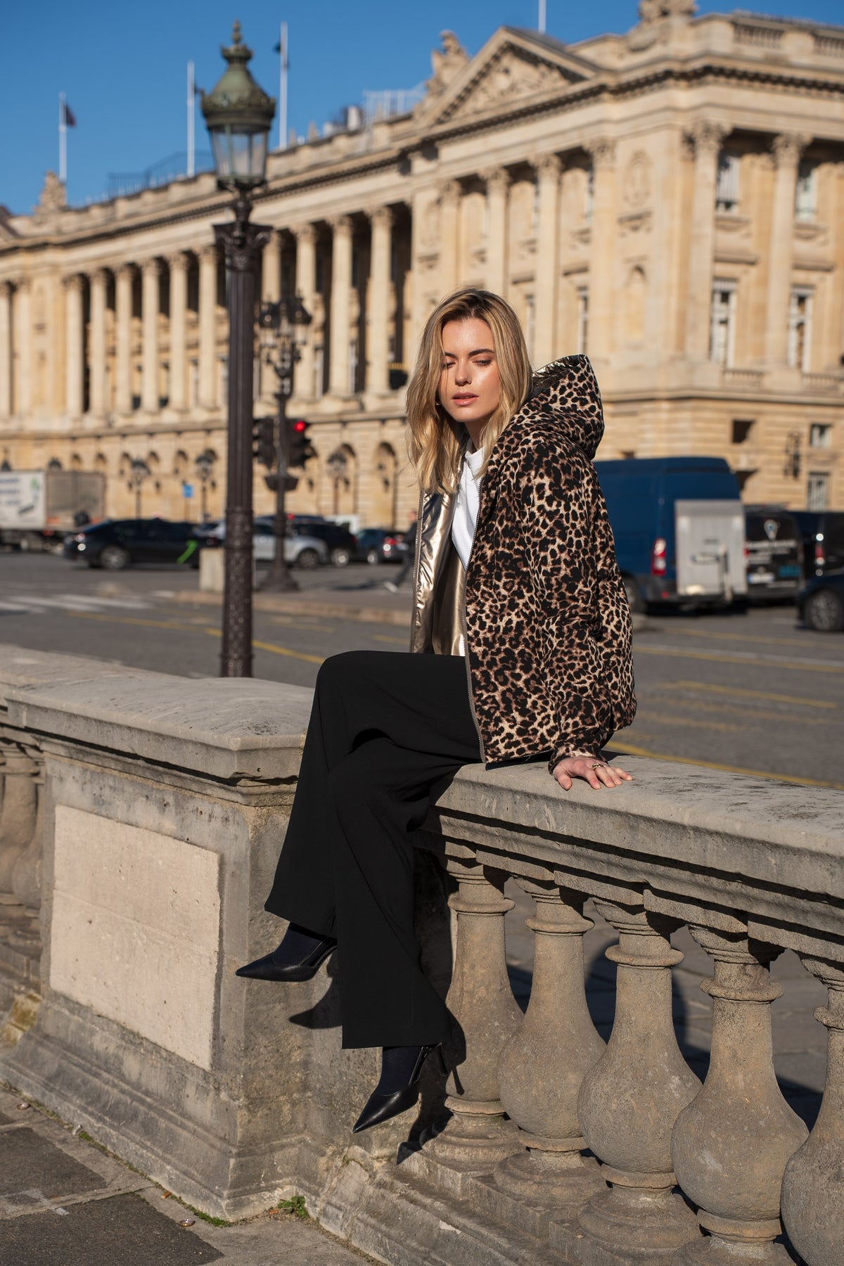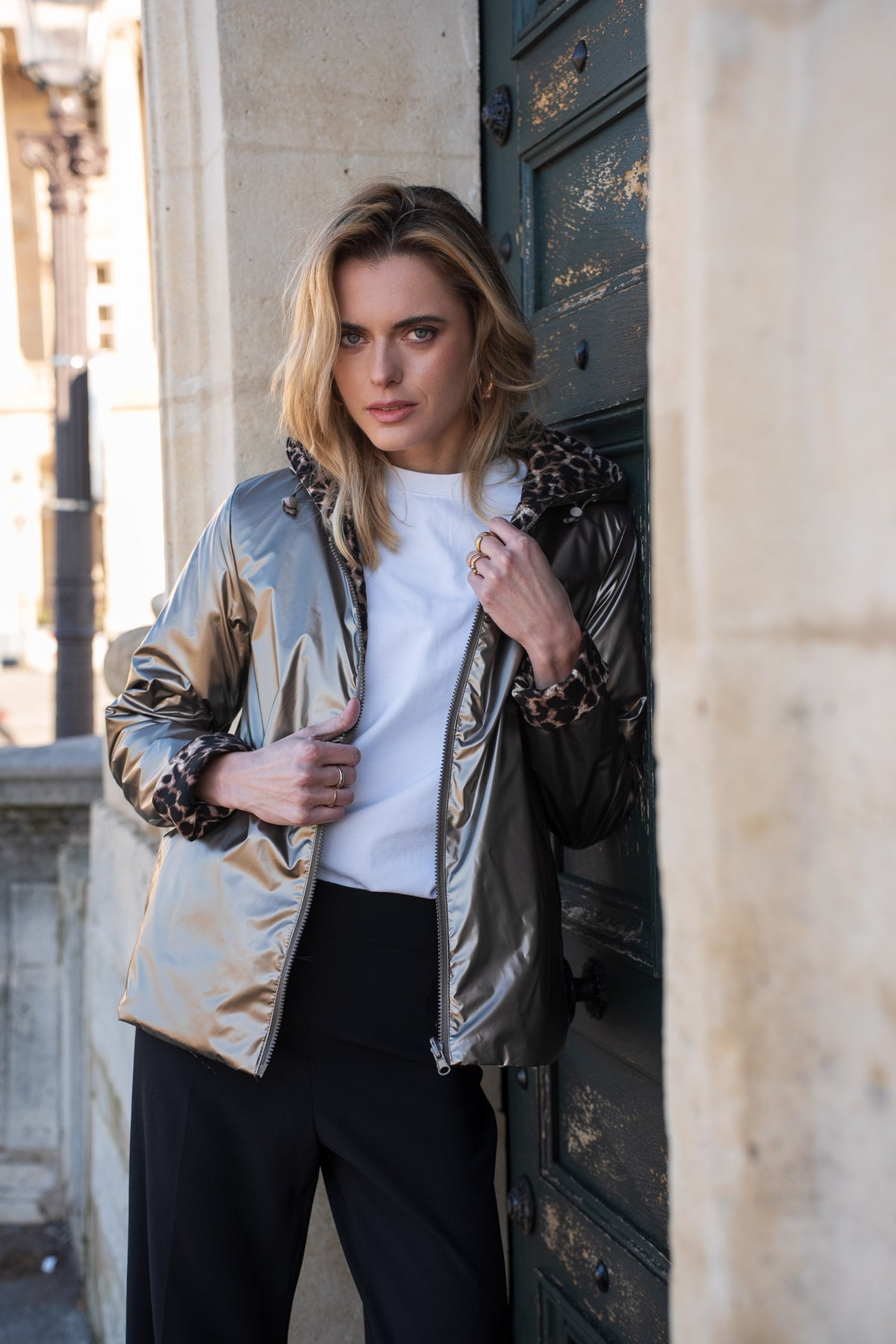 Découvrez la veste mi-saison idéale : un imperméable réversible court en version léopard, parfait pour rester élégante tout en étant protégée des intempéries.